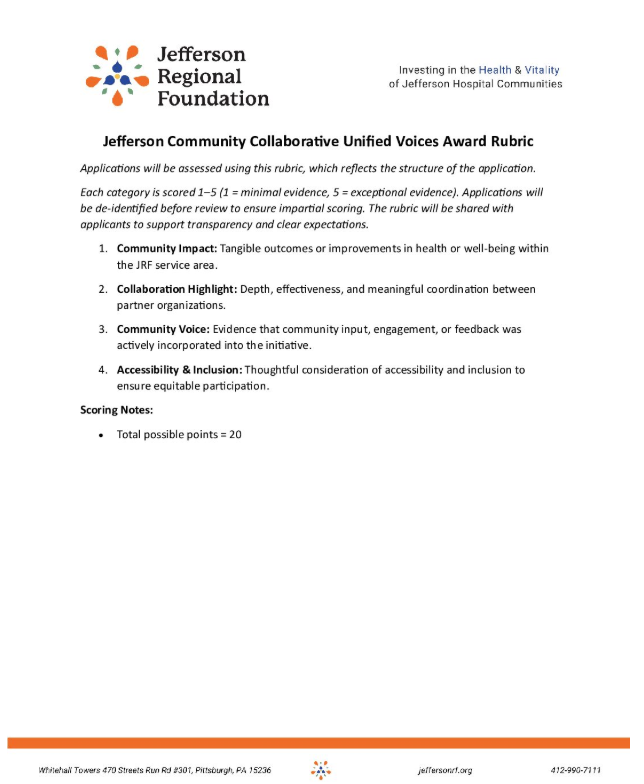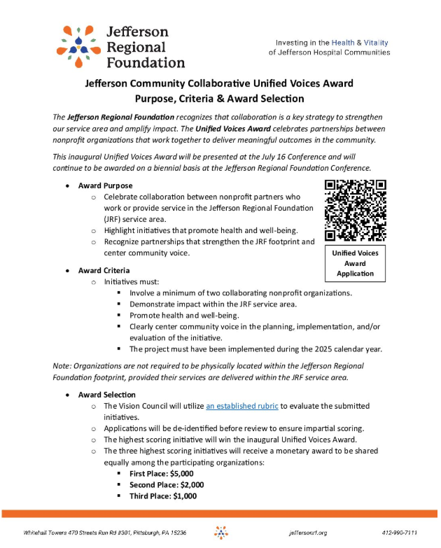 July 2026 Conference The Jefferson Regional Foundation will be hosting a one-day conference themed Going the Distance: Progress, Partnerships & Purpose for nonprofit partners on July 16, 2026. This event will feature keynote speaker, Tamara Tunie, a Mon Valley native, alumna of Carnegie Mellon University, & acclaimed actor and philanthropist. The Unified Voices Award The Jefferson Regional Foundation recognizes that collaboration is a key strategy to strengthen our service area and amplify impact. The Unified Voices Award celebrates partnerships between nonprofit organizations that work together to deliver meaningful outcomes in the community. This inaugural Unified Voices Award will be presented at the July 16 Conference and will continue to be awarded on a biennial basis at the Jefferson Regional Foundation Conference. Apply today via the Unified Voices Award Application. Learn more via the Jefferson Community Collaborative Unified Voices Award Purpose, Criteria & Award Selection and Jefferson Community Collaborative Unified Voices Award Rubric.